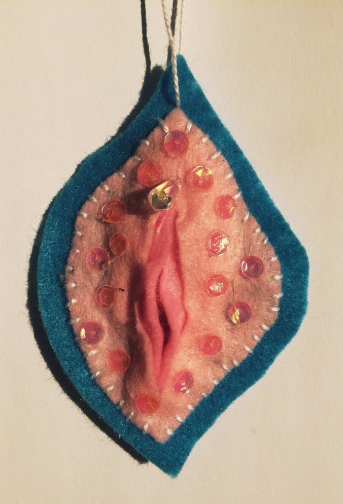 Next create the inner labia by cutting a slightly smaller lemon-shaped oval, perhaps from a different shade of felt. Again, cut a line down the middle to create an opening.